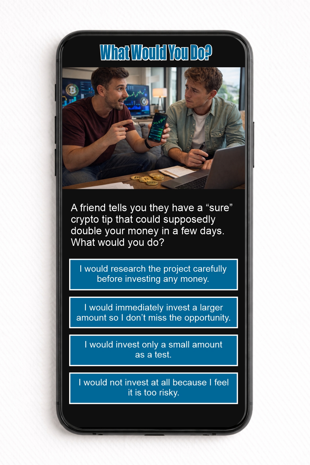 Below the image, you can read the description of the situation itself, presenting an everyday yet thought-provoking financial scenario. Beneath the text, four different answer options appear as buttons. Each represents a possible reaction to what the user might do in that particular situation.
