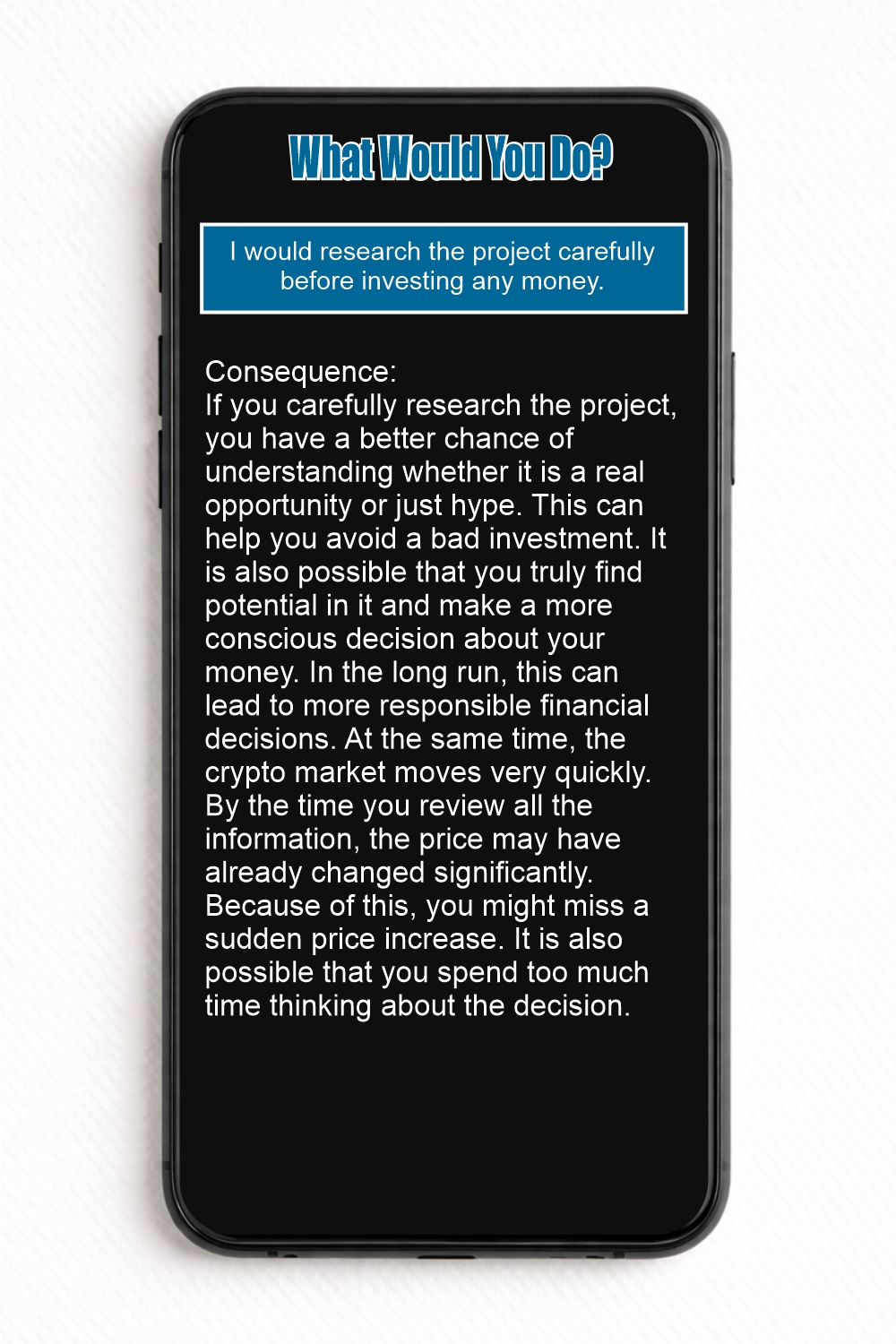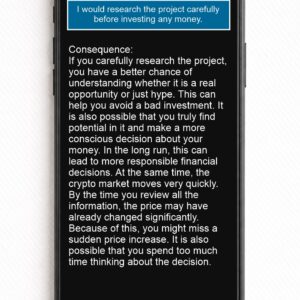 When the user taps one of the answers, a detailed text immediately appears describing the possible consequences of that choice. The explanation helps the user reflect on how the decision might affect financial security, risk-taking, and long-term financial thinking.