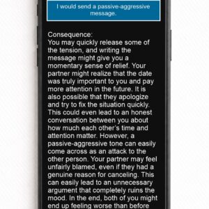 When the user taps one of the answers, a detailed text immediately appears describing the possible consequences of that choice. The explanation helps the user reflect on how the decision might affect the dynamics of the relationship, emotions, and communication.